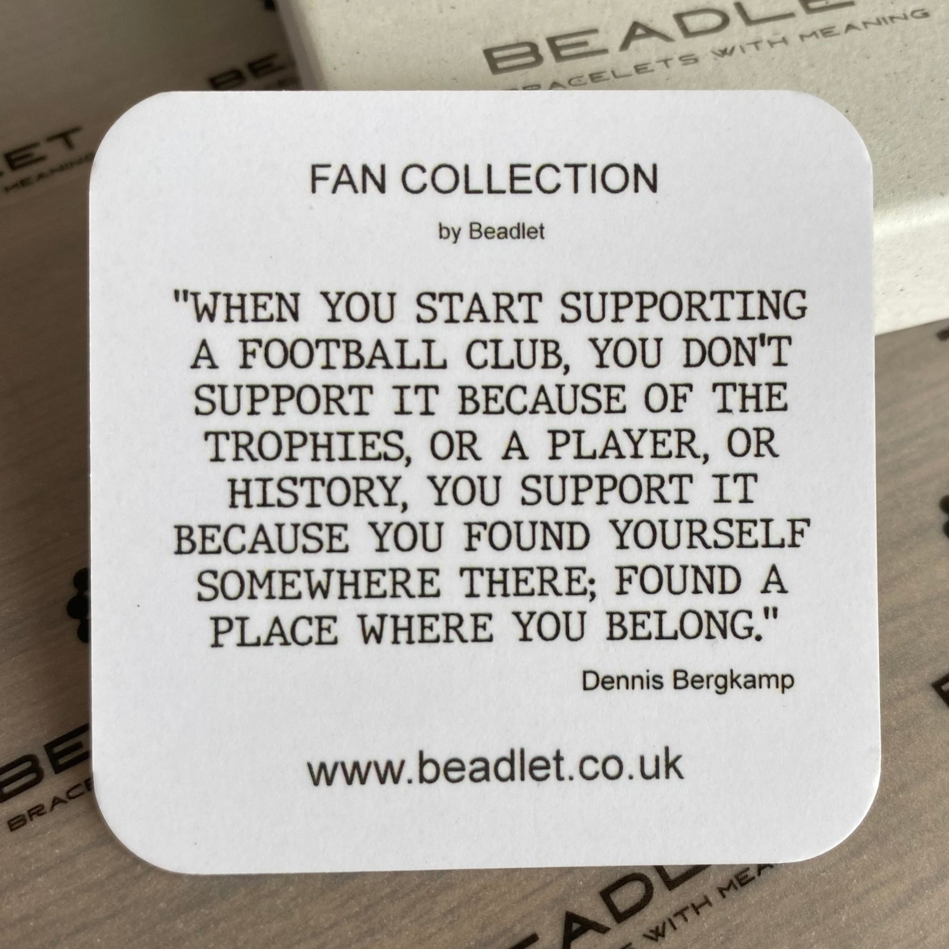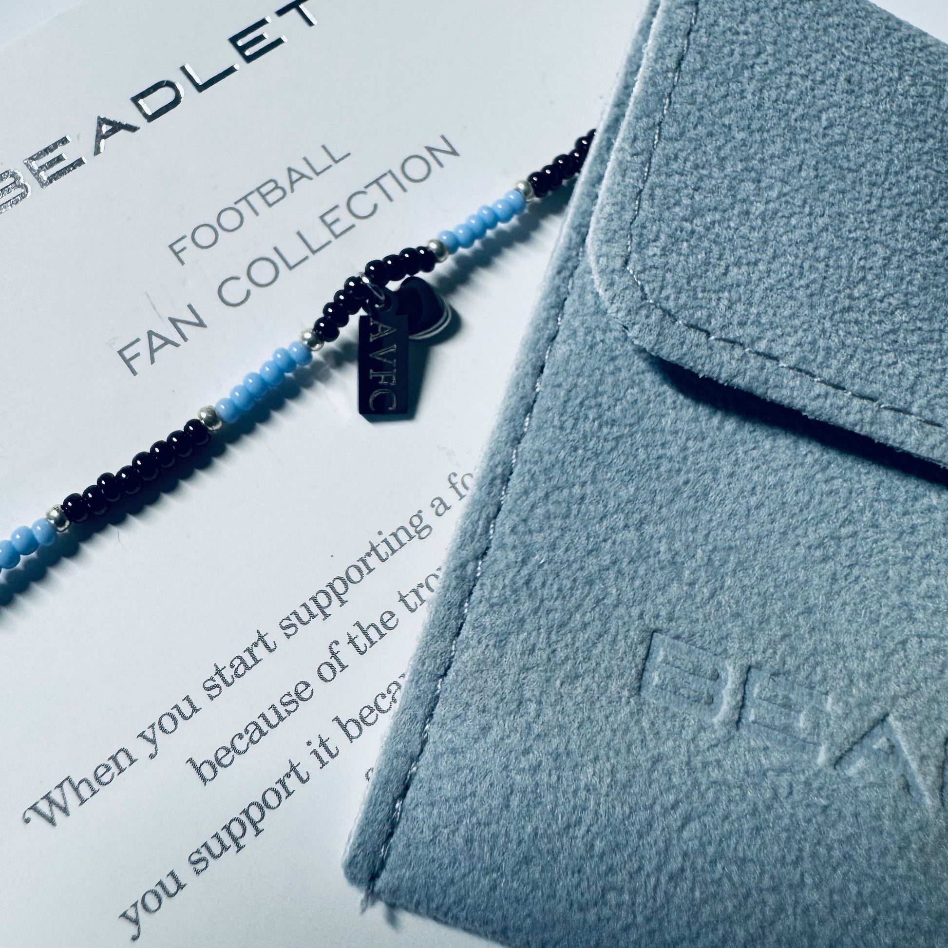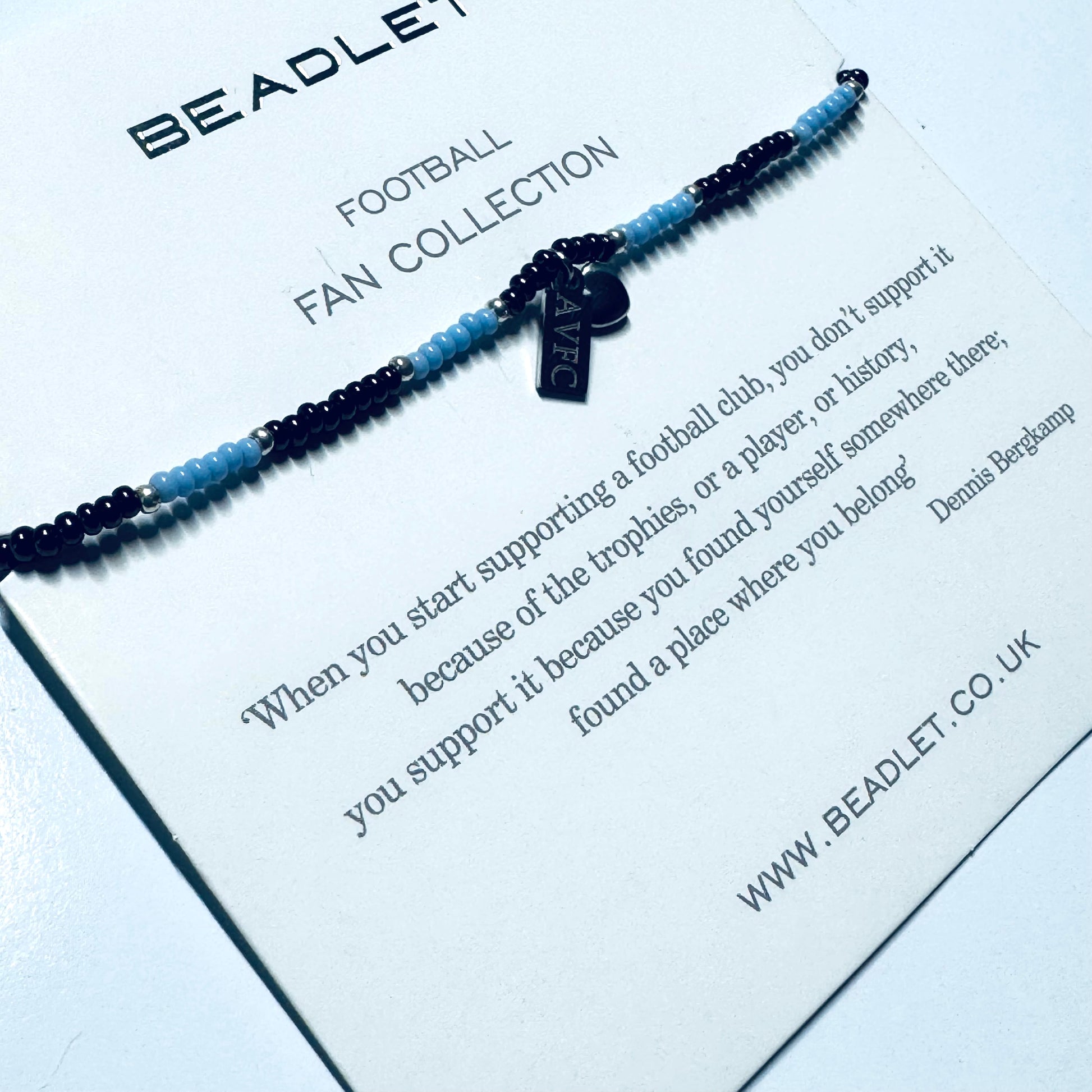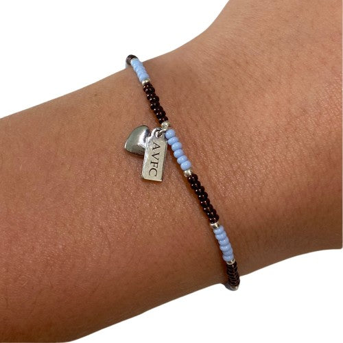 A beautiful hand crafted Football Fan seed bead bracelet in Aston Villa FC colours. Made from quality Czech Preciosa glass beads and enhanced with a subtle AVFC and  heart charm.