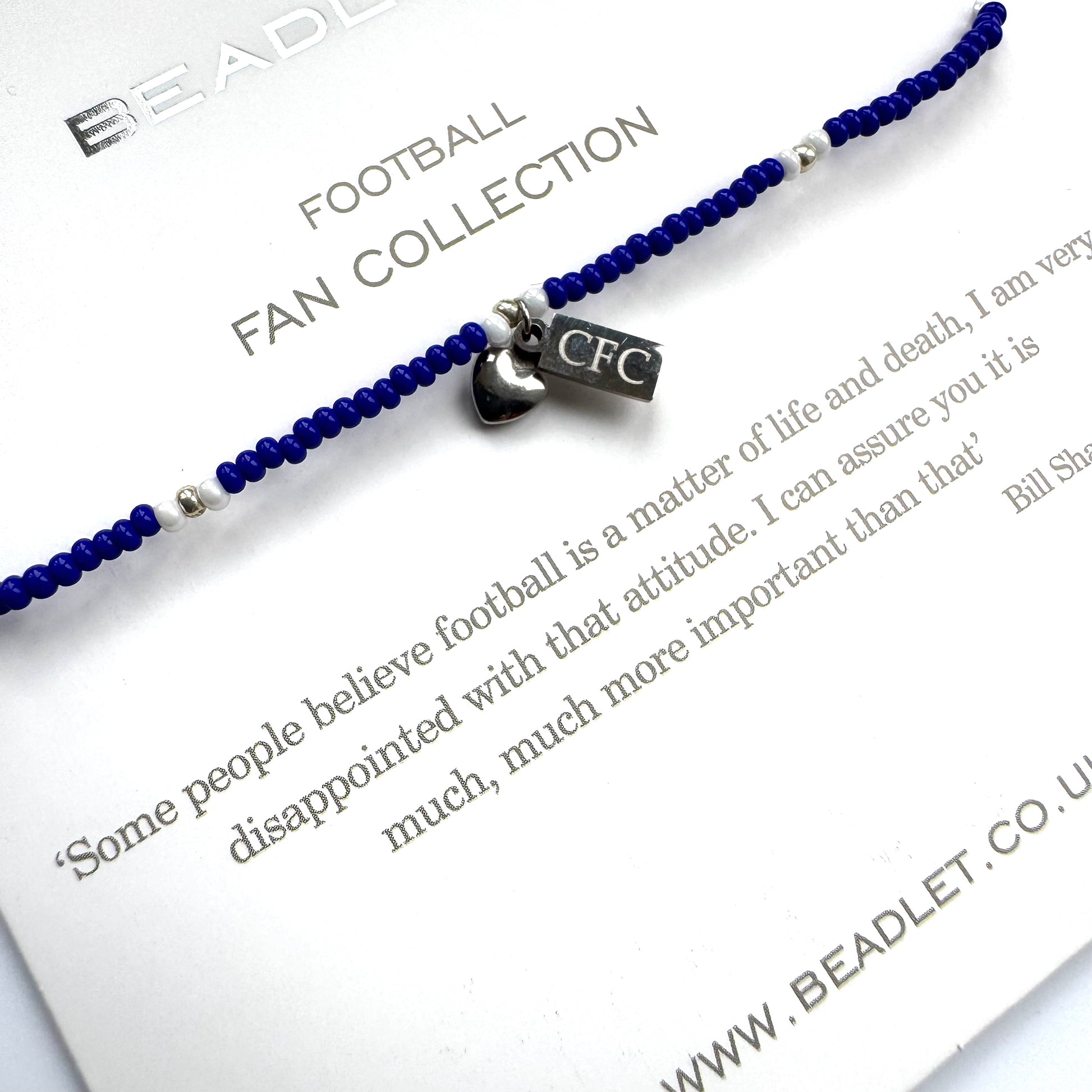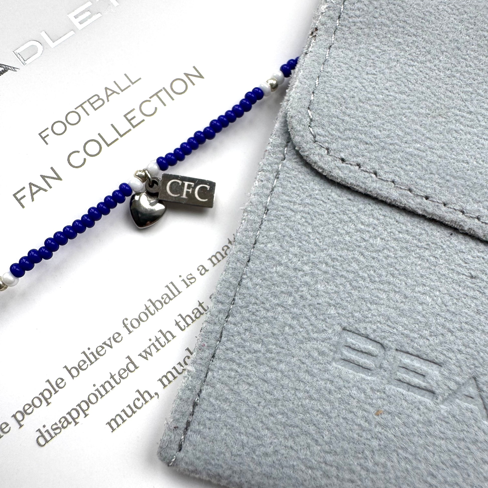 A beautiful hand crafted Football Fan seed bead bracelet in Chelsea FC colours. Made from quality Czech Preciosa glass beads and enhanced with a subtle CFC and heart charm.