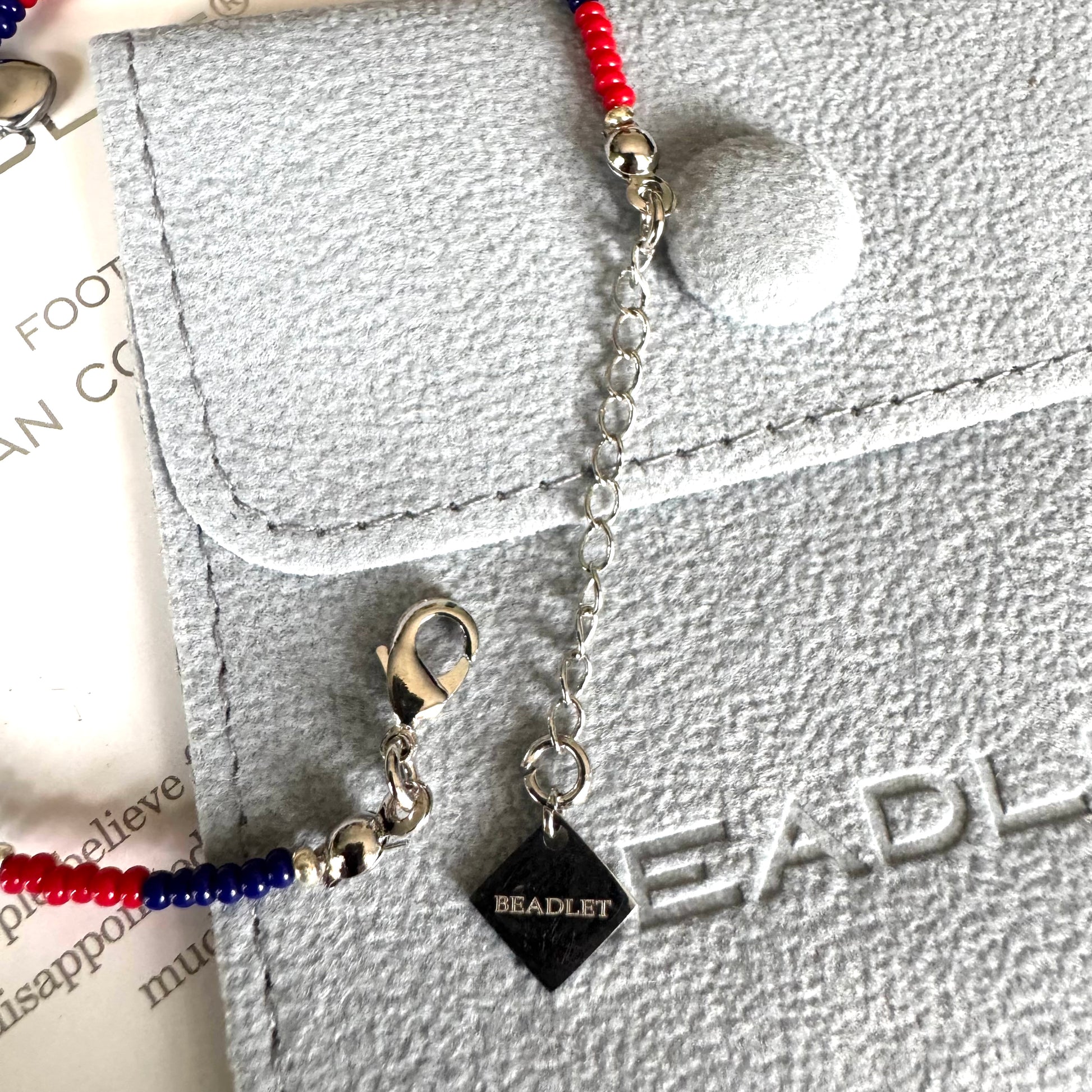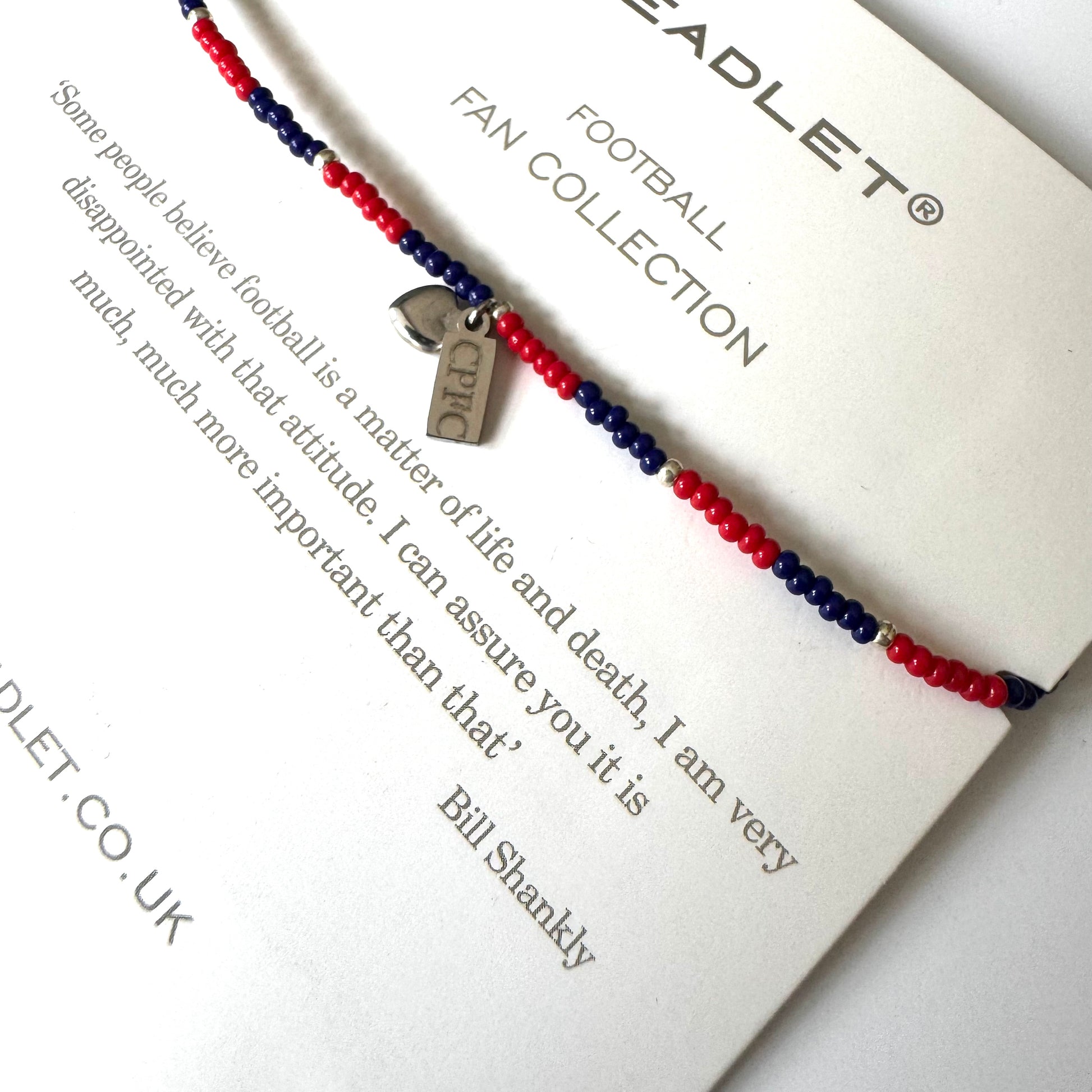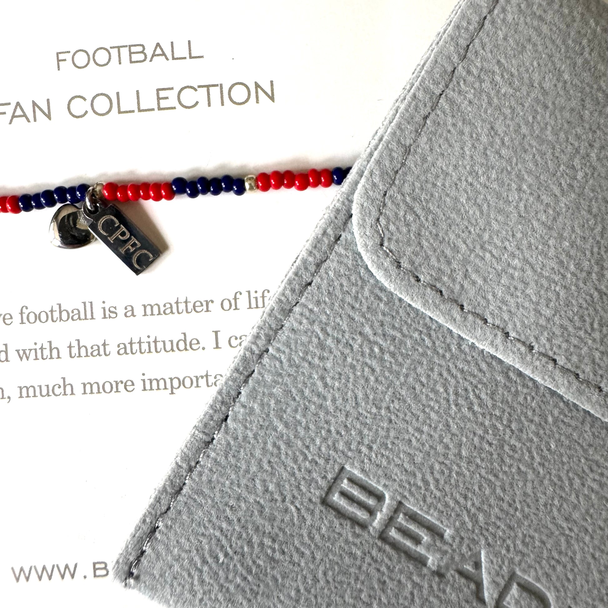 A beautiful hand crafted Football Fan seed bead bracelet in Crystal Palace FC colours. Made from quality Czech Preciosa and Miyuki glass beads and enhanced with a subtle CPFC and heart charm.
