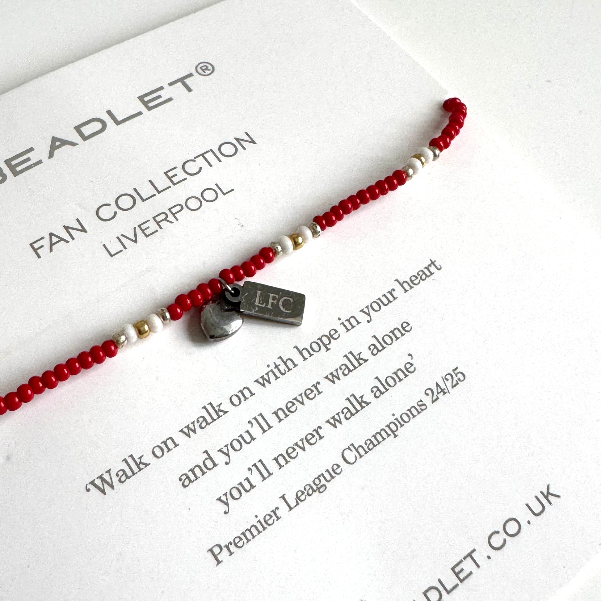 A beautiful hand crafted Football Fan seed bead bracelet in Liverpool colours. Made from quality Czech Preciosa glass beads and enhanced with a subtle LFC and heart charm.