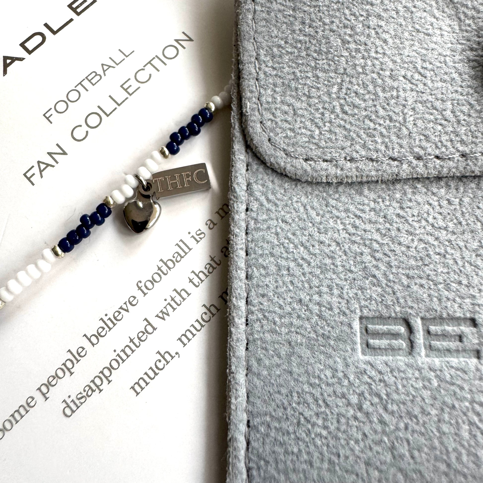 A beautiful hand crafted Football Fan seed bead bracelet in Tottenham Hotspur colours. Made from quality Czech Preciosa glass beads and enhanced with a subtle THFC and heart charm.