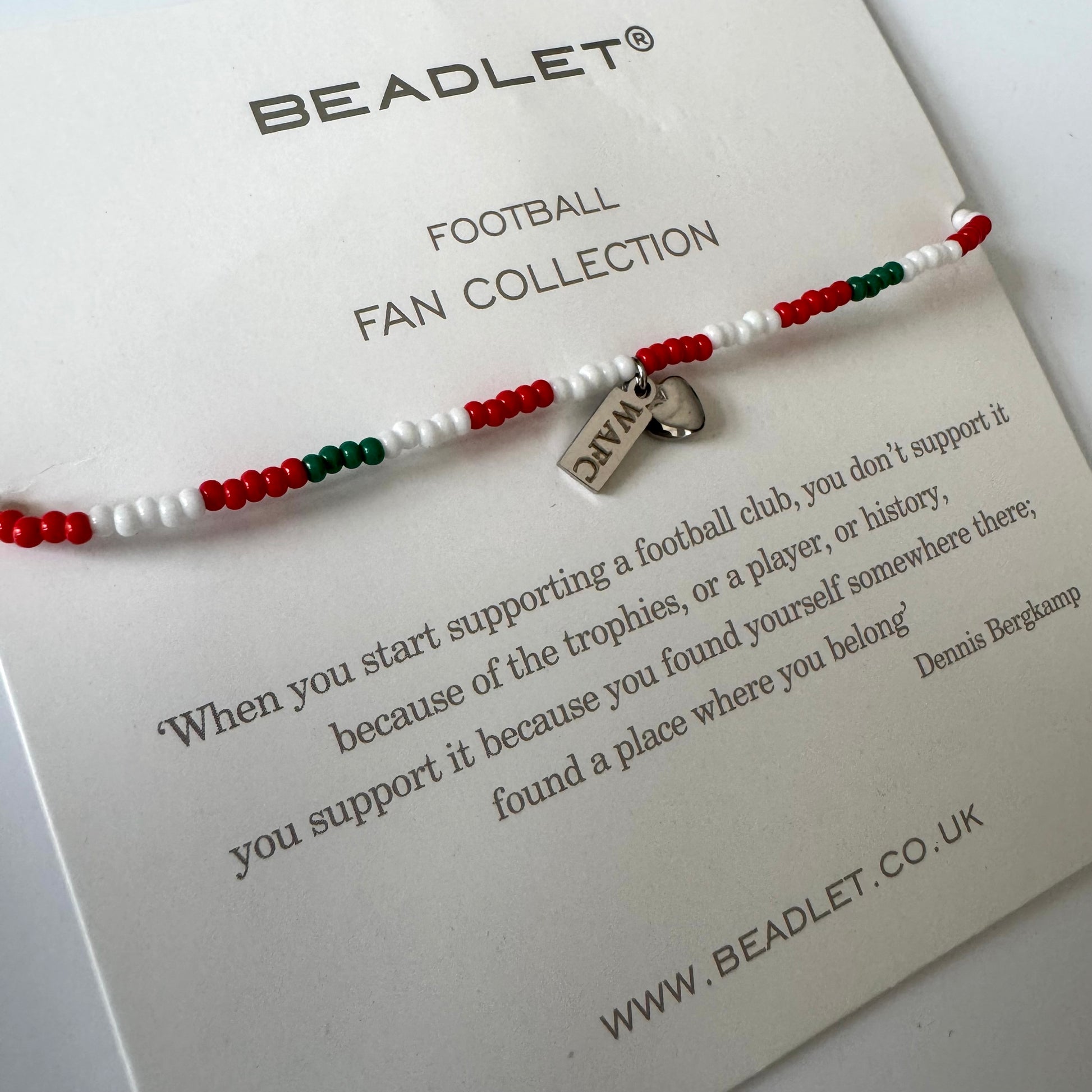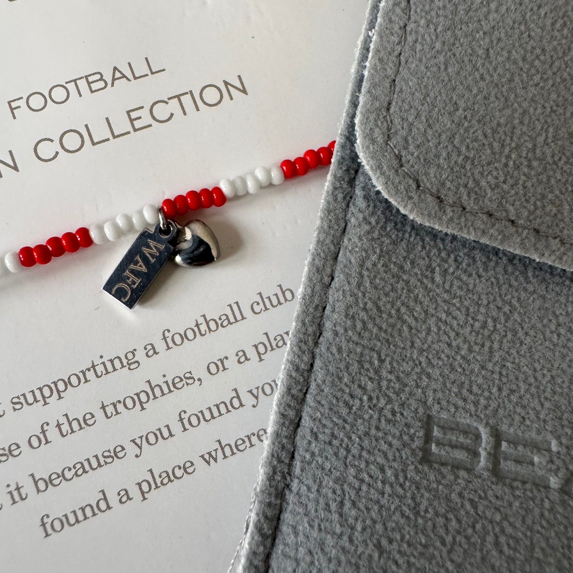 A beautiful hand crafted Football Fan seed bead bracelet in Wrexham AFC colours. Made from quality Czech Preciosa glass beads and enhanced with a subtle WAFC and heart charm.